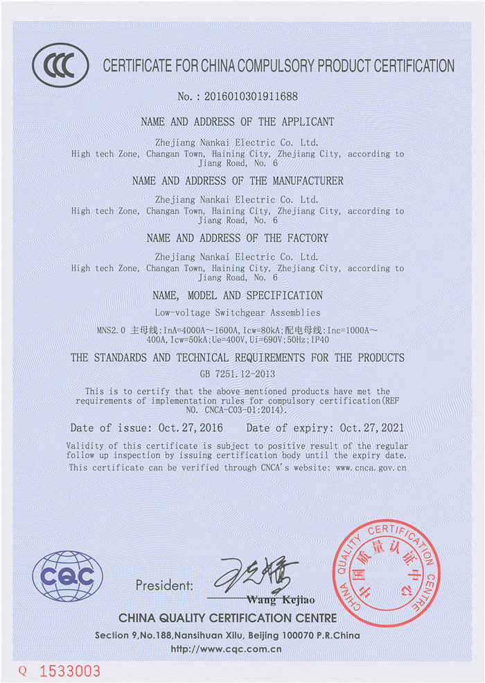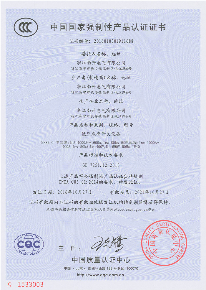 MNS2.0 4000A~1600A 3C证书