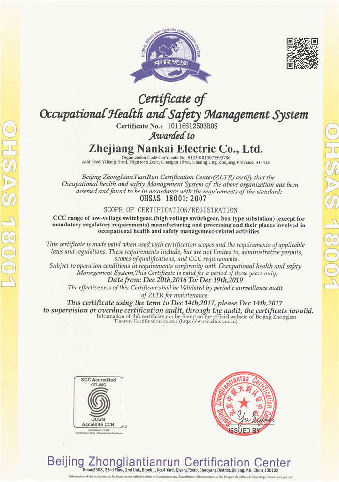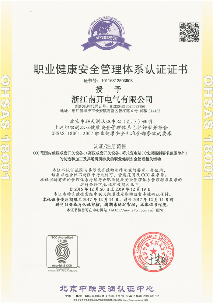 OHSAS18001健康体系证书